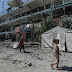 | nternally displaced Palestinians walk in the courtyard of a destroyed UNRWA school |